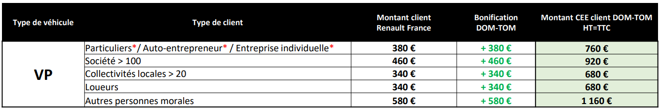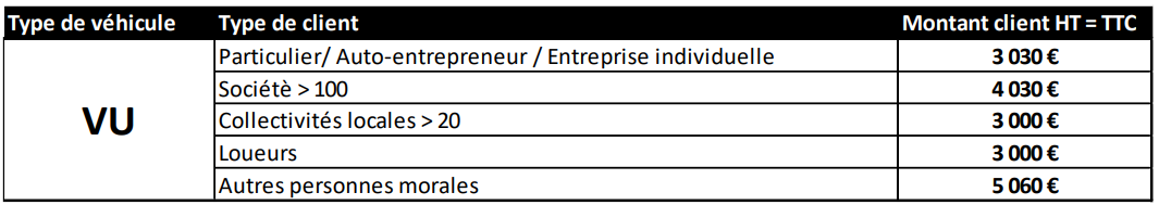 Ces montants s’appliquent uniquement aux voitures particulières (VP) ou véhicules utilitaires neuves commandées à partir du 31 août 2025.